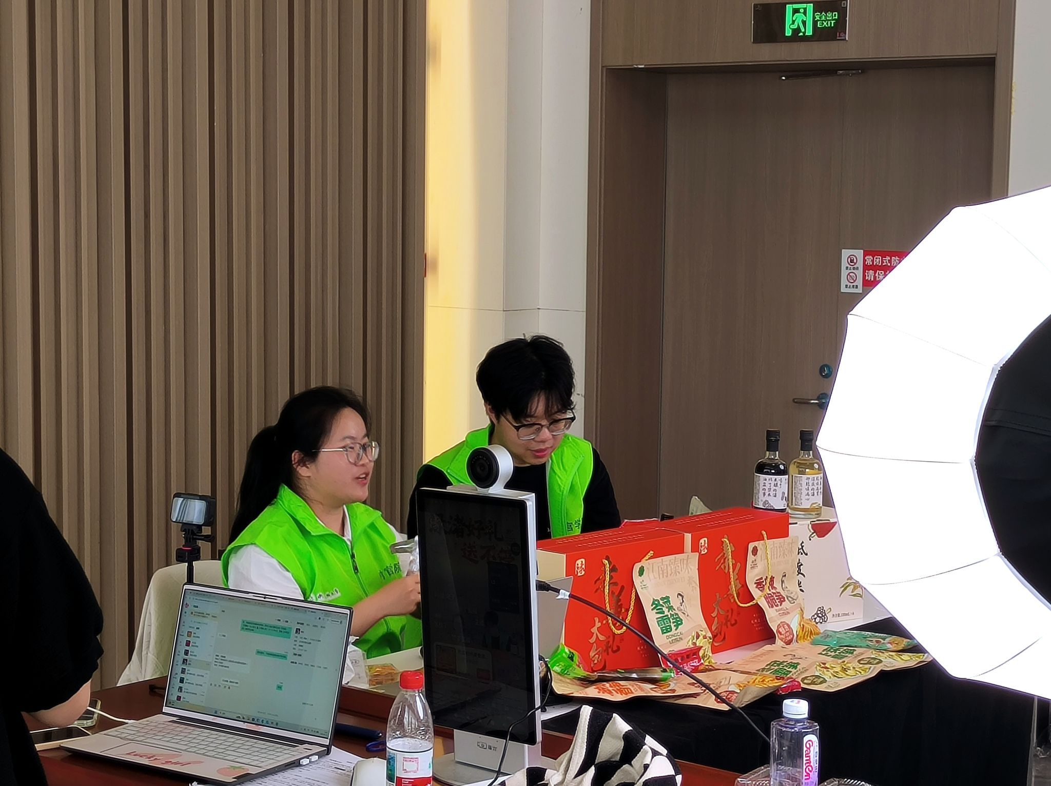 在阆坞村村播基地,另一组实践团成员迅速布置直播间,将笋干、米酒等特色农产品整齐上架。在村委工作人员的指导下,大家轮流担任主播、助播、场控等角色,用生动语言介绍产品工艺与风味。“这款笋干是渌渚镇的‘明星产品’,采用传统工艺制作,口感脆嫩,无论是配饭还是现吃都很适合!”直播间互动热烈,团队还通过多平台同步直播、短视频预热等方式,有效提升了直播间流量与关注度。不少观众被孝善文化打动,纷纷下单支持。