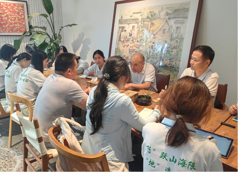 下午,实践团与余东村党支部书记余晓勤开展座谈交流。余晓勤从发展历程、区域协同、产业模式三个维度,详细讲述了余东村从“柑橘种植村”到“文化艺术村”的蜕变。他介绍,2003年“千万工程”实施以来,余东村在改善人居环境的同时,组建农民画队伍、打造艺术场景,逐步形成画村特色、培育崇礼善画的乡风。2020年,村集体成立全资运营公司,推动农民画从“墙上艺术”走向“产业经济”,通过卖作品、卖版权、卖品牌实现文化变现,构建起“原乡人守土、归乡人创业、新乡人赋能”的多元发展格局。
