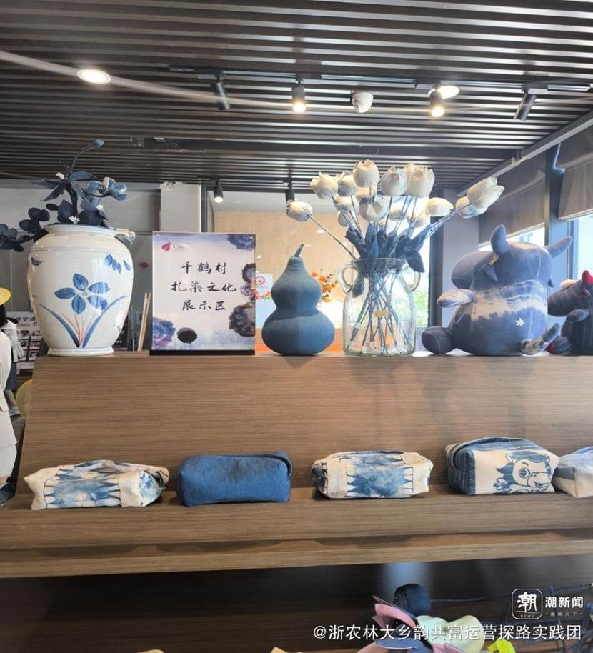 作为“妇女能顶半边天”思想的重要发源地,千鹤村以红色文化为根脉,走出了一条“红色IP+乡村运营”的特色共富路。实践团走进千鹤书屋,只见扎染布艺、手工旗扣、女性手包等特色手工艺品琳琅满目,非遗扎染、千鹤鹤羽、蚕丝绒制作等体验项目,让“文化+文创”的产业生态触手可及。村社食堂里“为人民服务”的牌匾与老物件相映,更让红色底蕴与岁月风味交融。