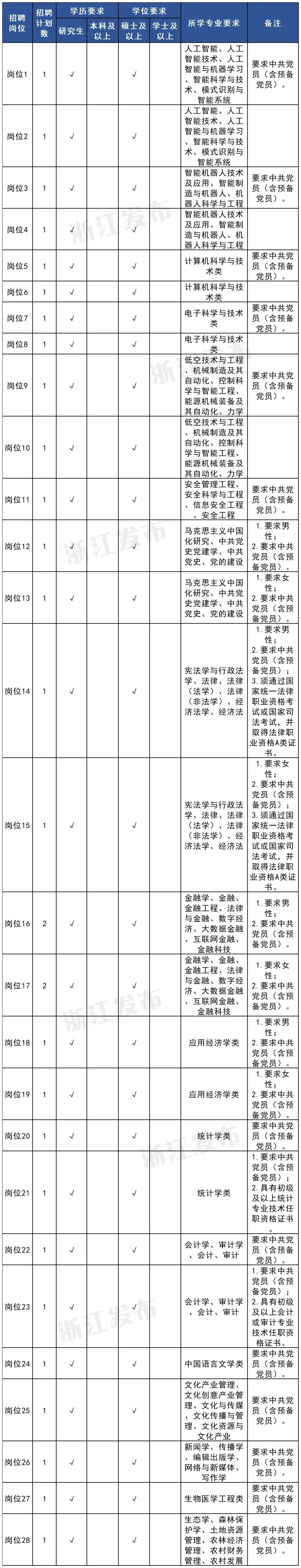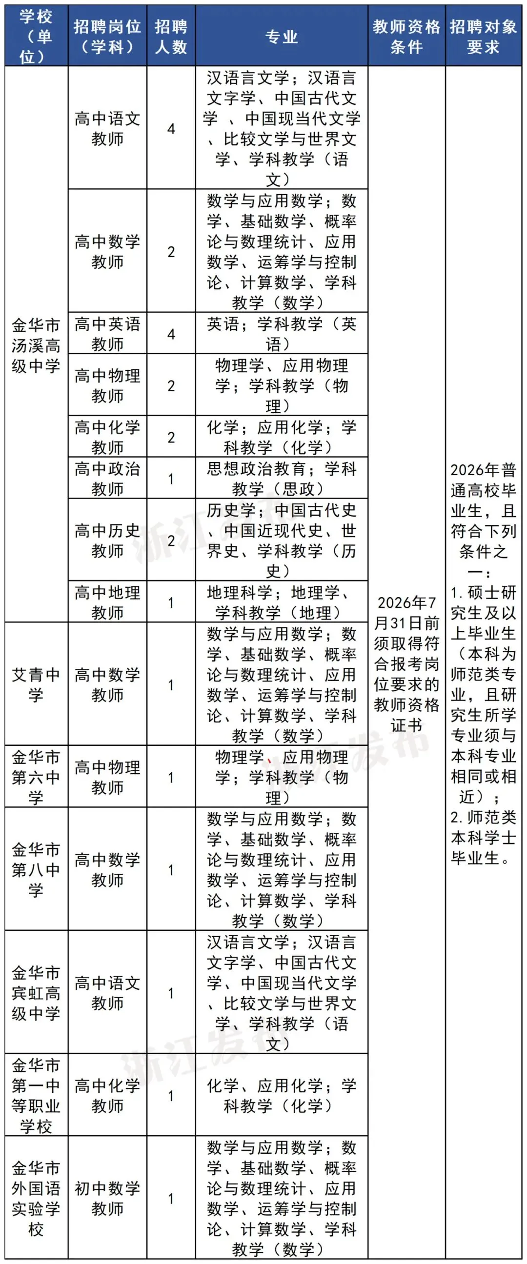 注:1.有关岗位专业条件参考教育部公布的专业目录(《普通高等学校本科专业目录》和《授予博士、硕士学位和培养研究生的学科、专业目录》),由招聘学校及金华市教育局负责解释;2.招聘单位排名不分先后。